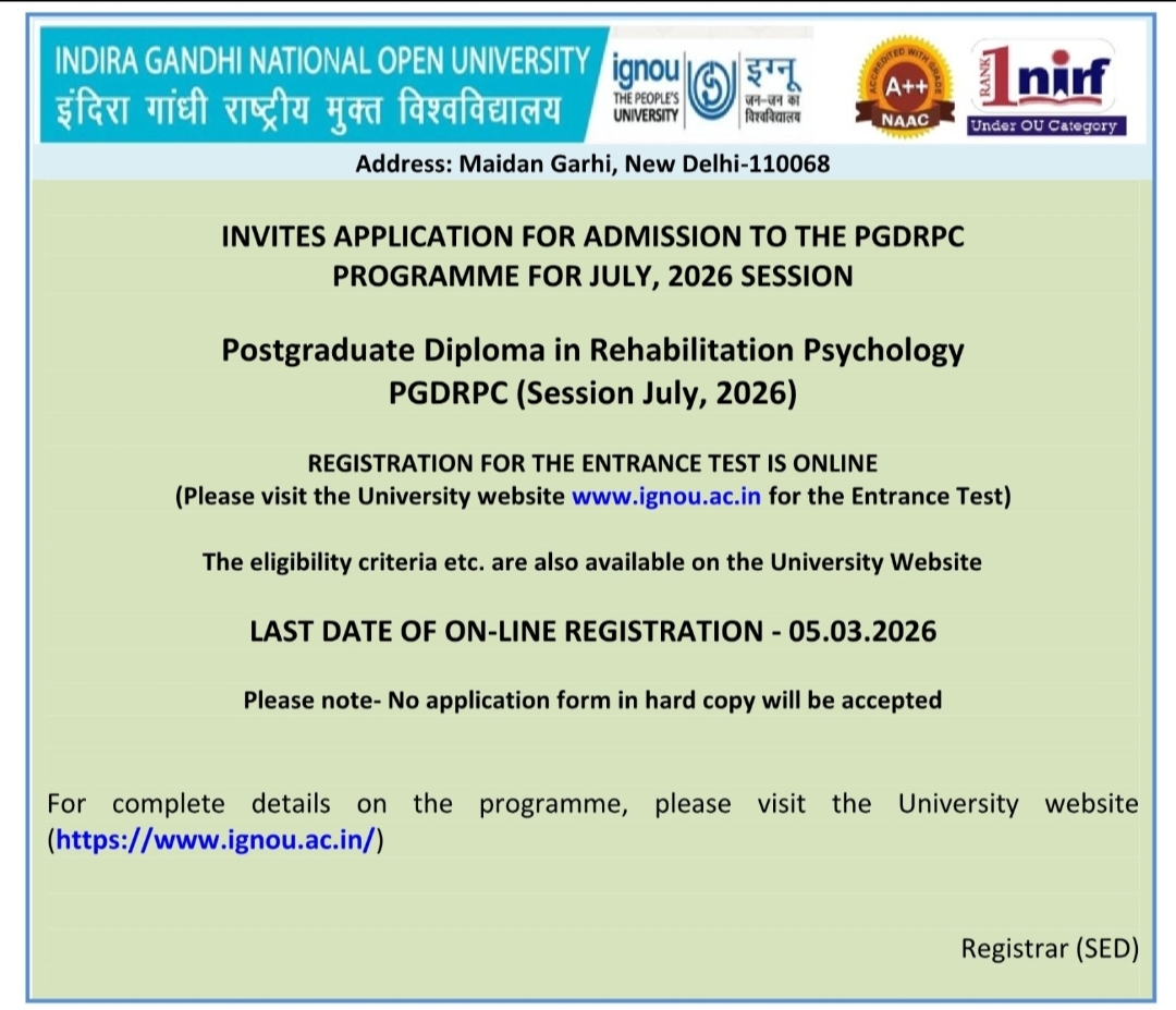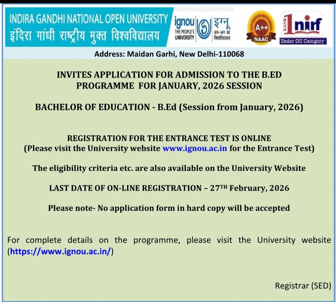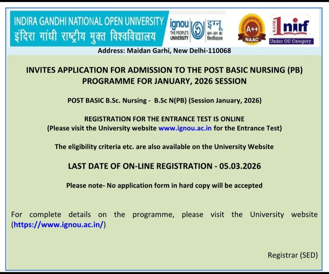 The Re-registration for the January, 2026 session for all ODL and Online programmes is starting from 1st December, 2025 to 15th January, 2026.