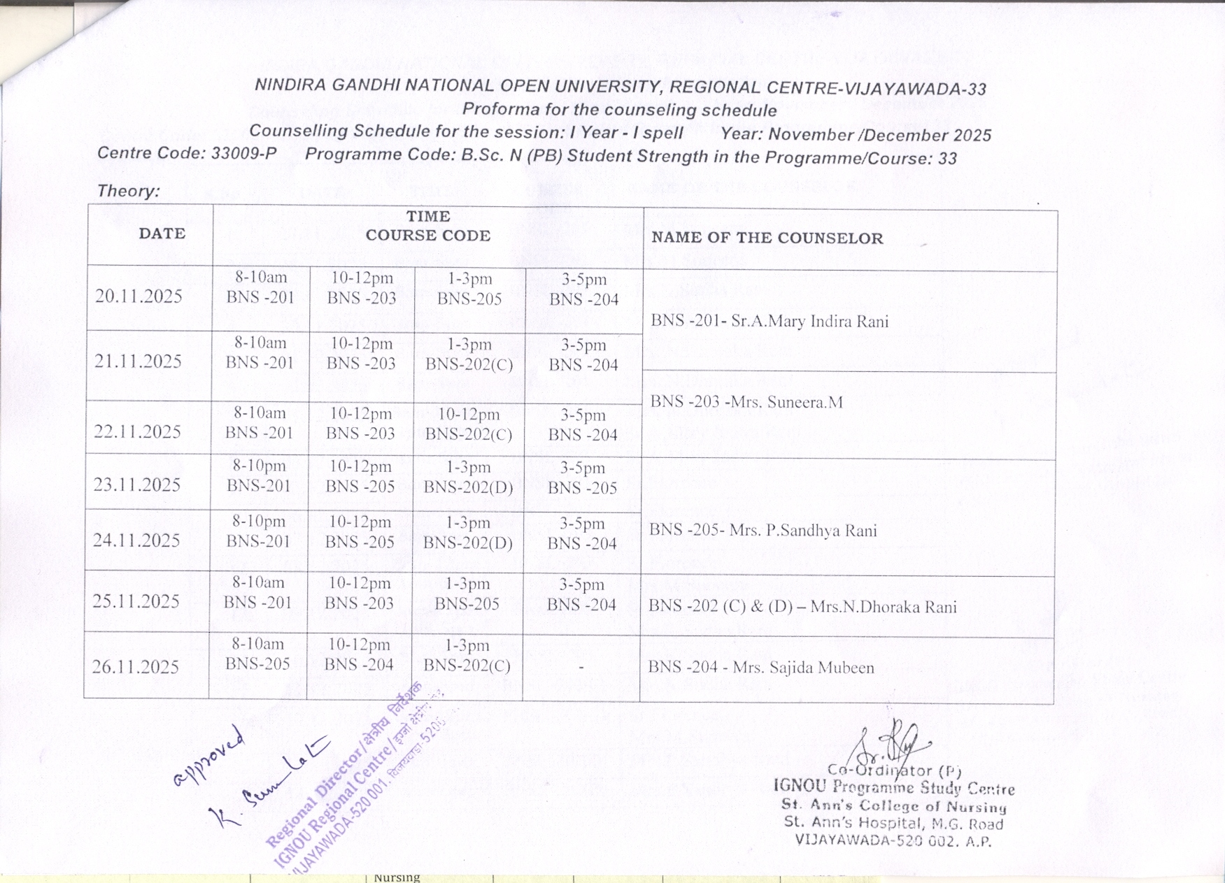LSC-33009 - B.Sc.N (PB) Counselling schedule for te session 2 nd year 1st & 2nd spell Year - September/October 2025 (Theory)