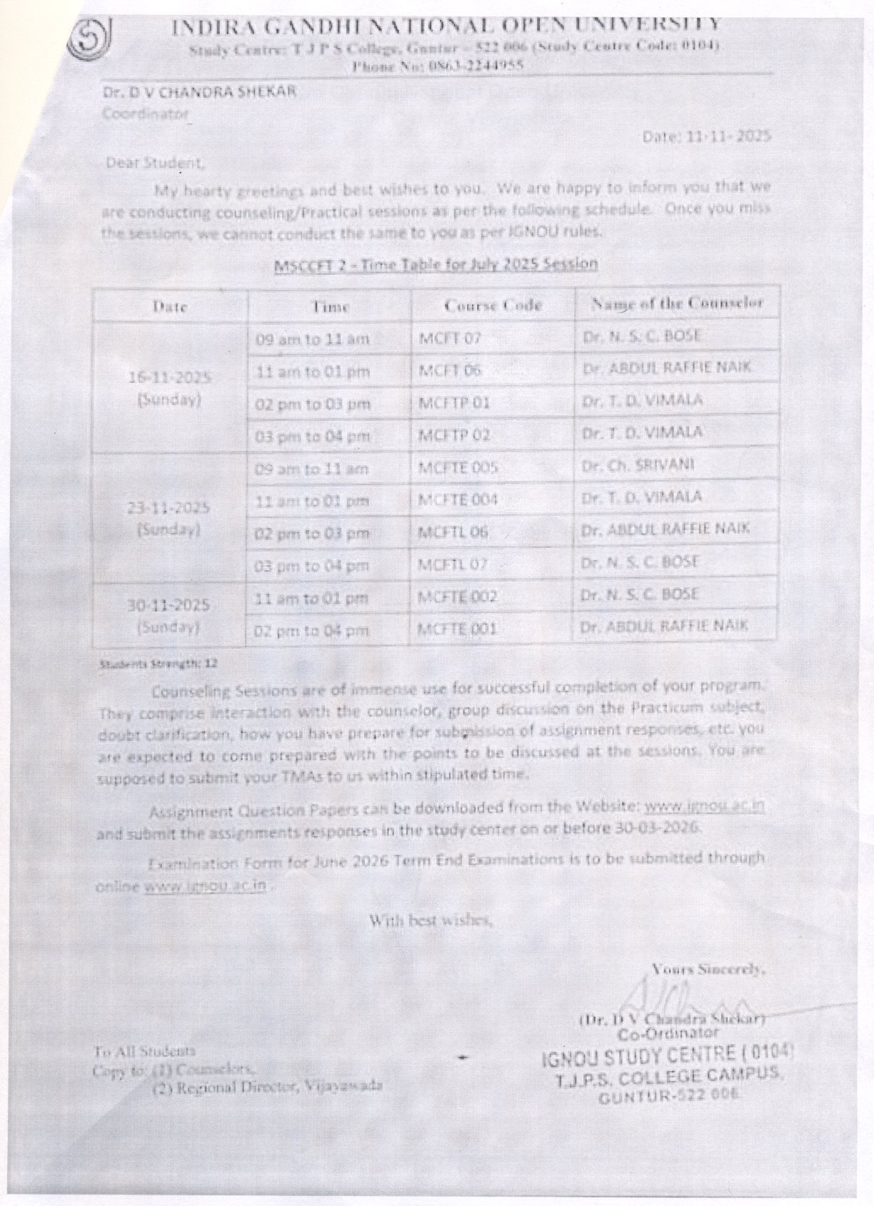 LSC-0104 MSCCFT & PGDCFT Counselling / Practical Schedule for July 2025